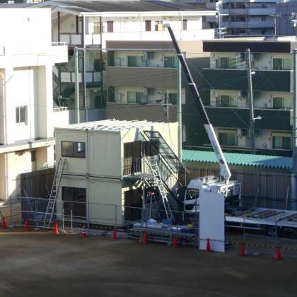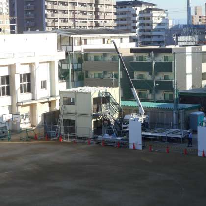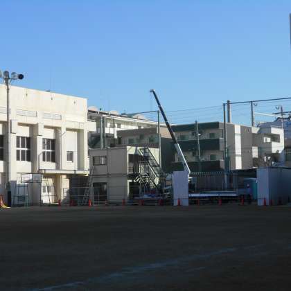 いよいよ2期工事の給食室の建て替え工事がはじまりました。12月16日現在、工事事務所の建設や運動場に工事用の通路を建設する作業に取り掛かっています。来年の3月いっぱいまでは、今の給食室で調理を行います。4月からは、運動場に建設予定の仮設の給食室での調理の実施予定です。運動場がせまくなりますが、ご理解とご協力をお願いします。