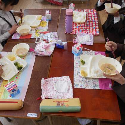 異学年と給食を通しての交流を図りました。緊張してなかなか話がはずまなかったところもありましたが、給食後には、上の学年の児童が、ゲームをリードしてくれました。
