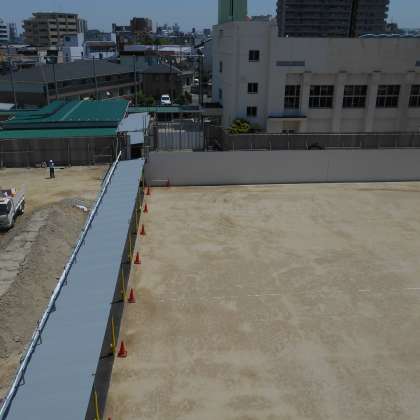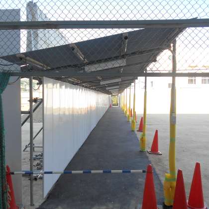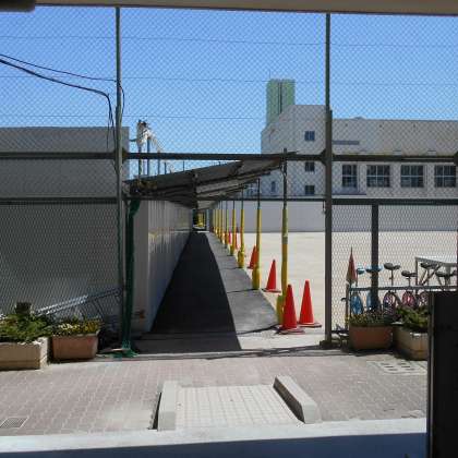 臨時休業中も給食室の解体が進んでいます。玄関をはいったところには、講堂まで仮設の渡り廊下がつくられました。1・4・5年生の皆さんは、教室までこの廊下を使っての