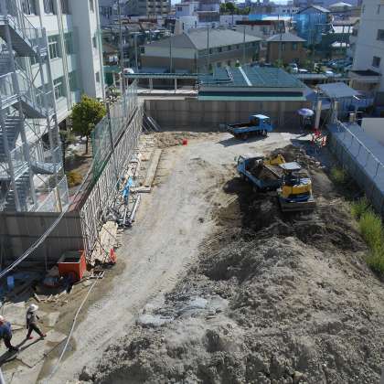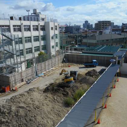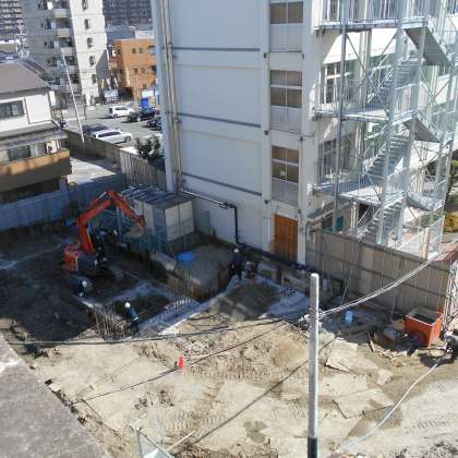 給食室の工事も、少しずつ進んでいます。現在、基礎の部分に取りかかっています。