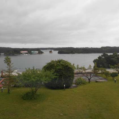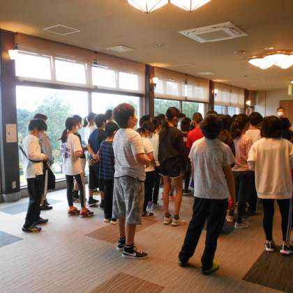 あいにくの雨で外には出ることができません。英虞湾のきれいな景色を眺めながら、室内での「朝の集い」となりました。