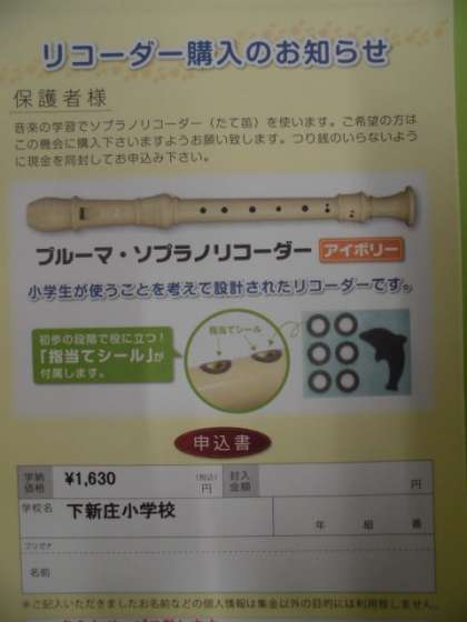 学年だよりにてお知らせしている3年生から使用するリコーダーの見本(写真)です。後日、申込の封筒をお配りしますので、各学級担任までお申し込みください。