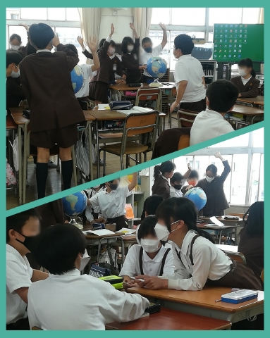 地球儀を使って各地の場所の確認を行っています。