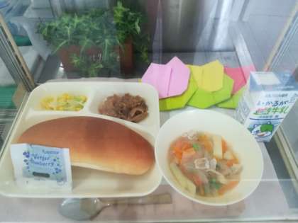 4/27 今日の給食は「豚肉のデミグラスソース」ほか です
