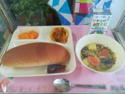 5/2 今日の給食は「豚肉と野菜のカレースープ煮」ほか