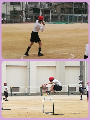 ソフトボールなげ、ハードルに取り組んでいます。