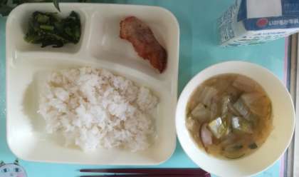 あすの給食は、「押し麦のグラタン」ほかです。(パン食)