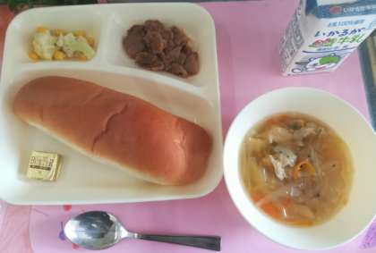 3/16 今日の給食は「豚肉のデミグラスソース」ほか