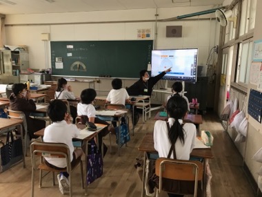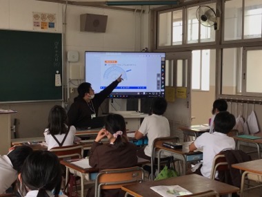 大型液晶モニターを使った、動画による、分度器の使い方をじっくり見て、正しい使い方を学んでいます。