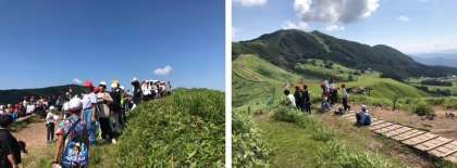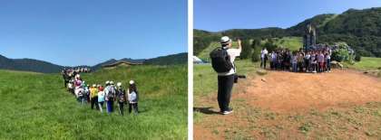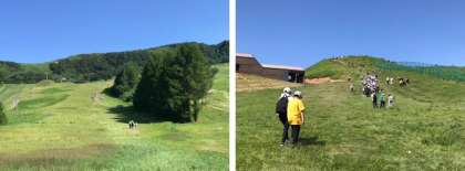 登山の山道は草原が続きます。日差しが少しずつ強くなってきていますが、みんな頑張って頂上をめざして歩みを進めます。