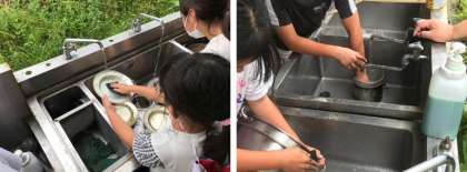 まきを使って調理すると、なべや飯ごうはススだらけになります。使う前は銀色に輝いていましたが、真っ黒になってしまいました。