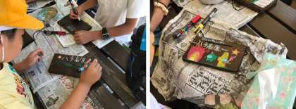 第1日に磨いた焼き板に絵を描いていきます。3日間の思い出や自分のお気に入りなど、思い思いに素敵な焼き板に仕上げていました。