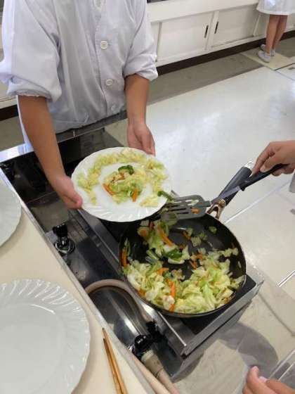 手順の説明を聞いた後、野菜を洗い、ピーマンとにんじんはせん切り、きゃべつは短冊切りにしました。フライパンに油を入れ、全体にいきわたらせた後、火が通りにくい野菜から順に炒め、最後に塩胡椒で味付けをしました。きれいに盛り付け見た目もよく、味もとてもおいしかったです。調理を終えたフライパンを洗う前に、フライパンに残っている油をペーパーでふき取りました。その方が環境にも優しく、手早くきれいに洗えることを学習しました。