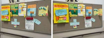 校内の掲示板に、各委員会が工夫を凝らして作った作品が掲示されています。