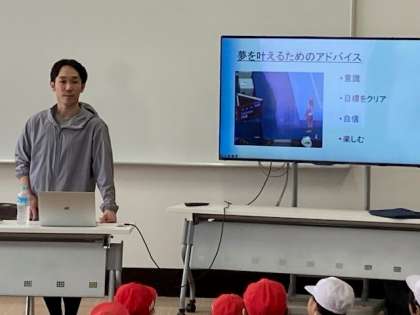 大阪出身で北京オリンピック体操男子団体総合銀メダリストの沖口誠さんを講師に、5年生に講演とマット運動の出前授業をしていただきました。