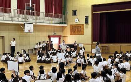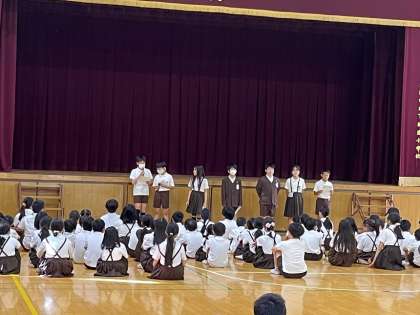 朝、児童集会が行われました。今日は集会委員会がヒントを出して、たてわり班で相談してホワイトボードに答えを書きました。ドーナツやのび太など今日のクイズは答えやすかったようです。