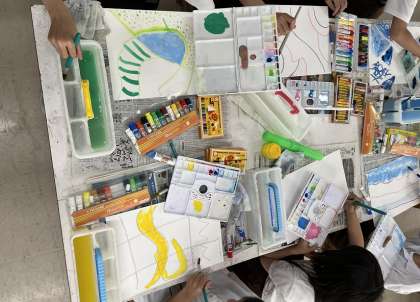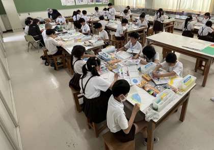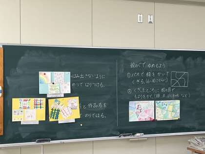 2時間目の授業は図工です。「絵のぐでゆめもよう」の授業で、パスで線を描いて区切ったところに絵の具でもようをかいています。