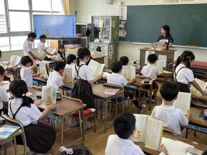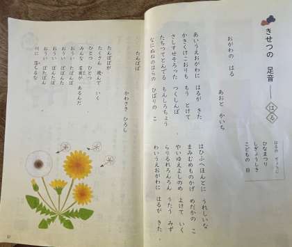 2時間目は国語です。「きせつの 足音」の「おがわの はる」という詩を音読しています。先生のタンバリンにあわせてリズムよく音読したり、自分で分担を決めたところを立って読んだりしています。