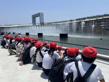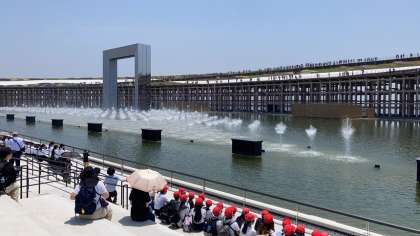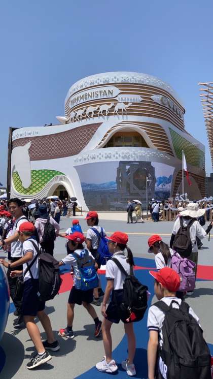 きれいなトリクメニスタン館の前を通って、ウオータープラザへ。「水と空気のマジカルダンス」の噴水ショーを見学しました。