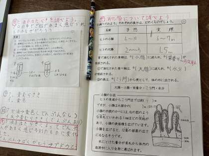 5時間目は理科です。からだのはたらきで、消化管について学習していました。伸ばすととても長い消化管は栄養分や水を体内に吸収する大切な役割を果たしています。、