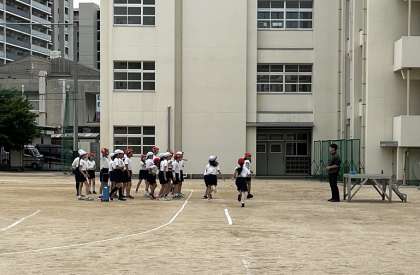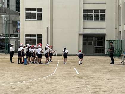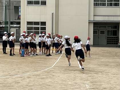 5時間目は、体育です。2チームに分かれてバトンリレーをしていました。周りの人たちも大きな声で応援していました。
