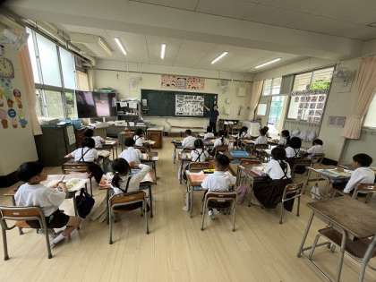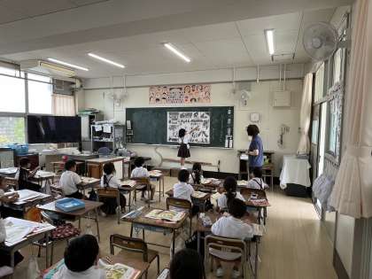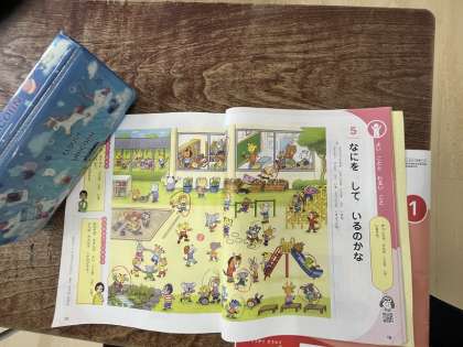 4時間目は、道徳です。「よい ことと わるい こと」の単元で運動場の遊具で遊んでいる絵を見て、「なにを して いるのかな」と考えて、よくないことをしている場面を見つけて発表していました。