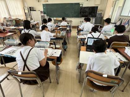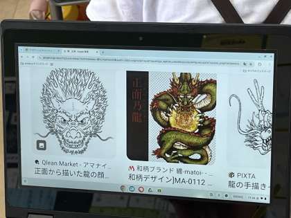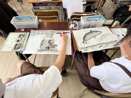 書写の時間に使う墨を使って、墨絵の絵を描いています。自分の学習端末でヒントになる絵を探して参考にしています。