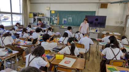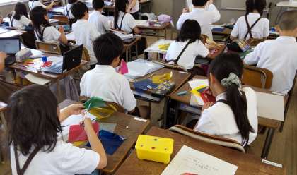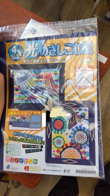 1時間目は図工です。「光のさしこむ絵」で、自分の描いた下絵の上に色付きのシートを貼り、枠も作って仕上げていきます。