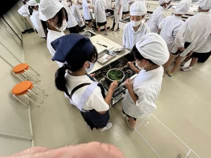 5・6時間目は、家庭科の調理実習です。青菜(ほうれんそう)のおひたしを協力して調理しました。「自分でつくったからおいしい」などとても好評でした。