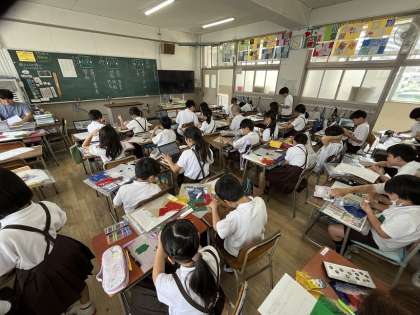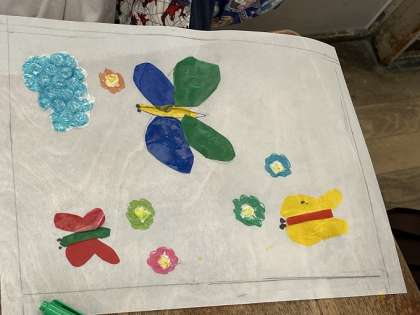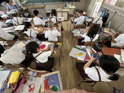 2時間目は図工です。色セロファンを下書きの絵に合わせて貼って完成させています。