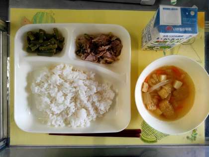 今日の献立は、豚肉の梅風味焼き、五目汁、さんどまめのごまあえ、ごはん、牛乳です。