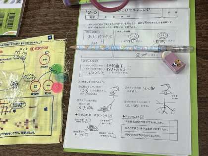 2時間目は家庭科です。「ボタンつけにチャレンジしよう」。ボタンつけに必要な縫い方について学習しています。