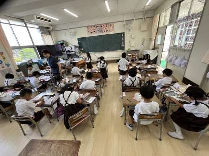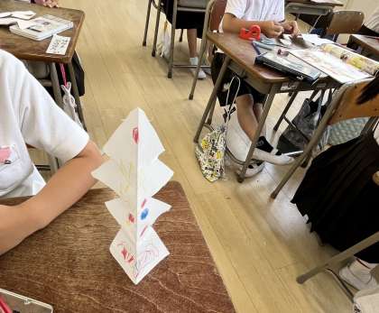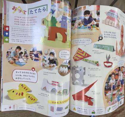 「おって たてたら」。画用紙をはさみで切って、形にそって色をぬり、折り目をつけて立てます。