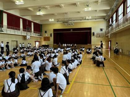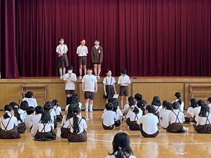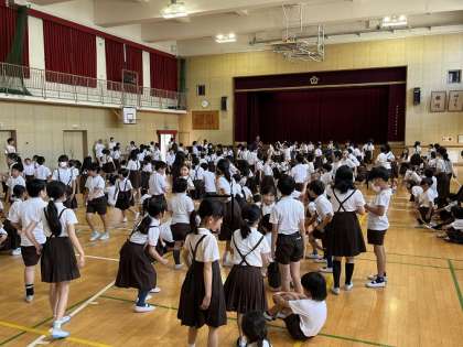 1年2組の転入生の紹介の後、集会委員会の児童の司会でゲームをしました。たて割り班ごとに、背の順、誕生日の順、名前順でそれぞれ一列に並びました。サッと並ぶのがなかなかむずかしいですね。