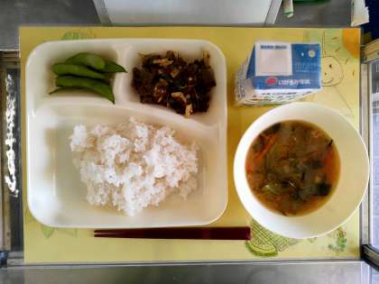 今日の献立は、チンジャオニューロウスー、中華みそスープ、えだまめ、ごはん、牛乳です。「チンジャオニューロウスー」は、青椒牛肉絲と書きます。ピーマンと細切りにした牛肉を炒めた中華料理です。豚肉を炒めた料理は、青椒肉絲「チンジャオロウスー」と書きます。中国では、豚肉が主として使われるので、「肉」というと豚肉を指します。