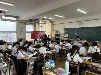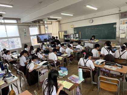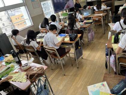 「ボタンづけにチャレンジしよう」の続きです、玉結び 玉どめ、名前のぬいとり、渡ぬい、本返しぬい、半返しぬい、ボタンつけ の練習をしています。