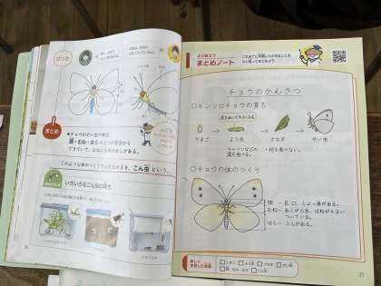 チョウのかんさつ。モンシロチョウが卵から成虫に育つようすについて学習しています。
