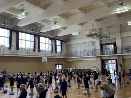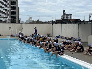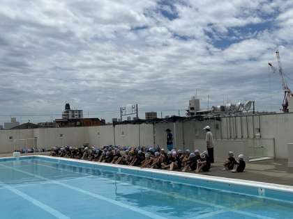 3・4時間目はプールに入る予定でしたが、気温が高いので、講堂で準備体操をしてから、屋上のプールでシャワーをあびて、座り方と動きの確認をしました。