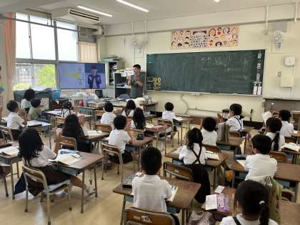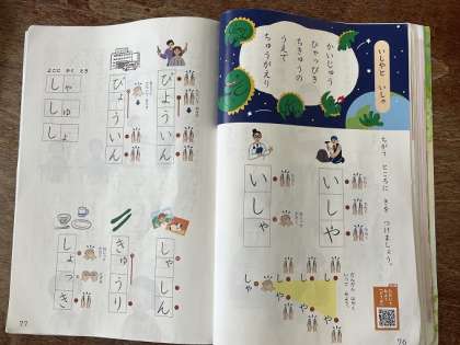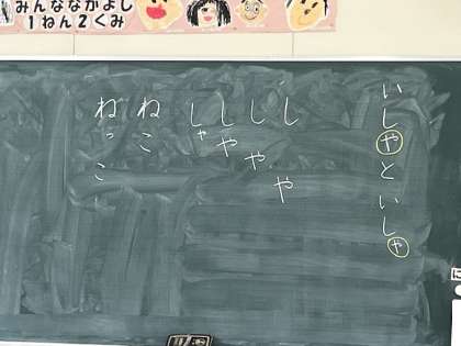「いしやと いしゃ」。手拍子で、小さい「ゃ」はねじってたたく、「っ」はにぎる などの変化をつけながら発音の仕方のちがいを学習しました。