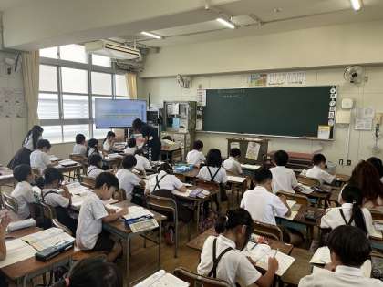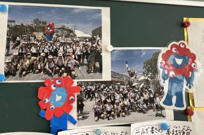 教室の後ろに万博遠足の写真が掲示されていました。