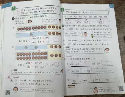 「100より 大きい 数を あらわした 数の線の よみ方を 考えよう」。数直線に表している数字を書きこんでいます。