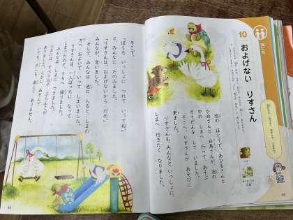 「およげない りすさん」。泳げないので、池の中のしまに行けなかったりすさんをどうしたらいいか考えています。