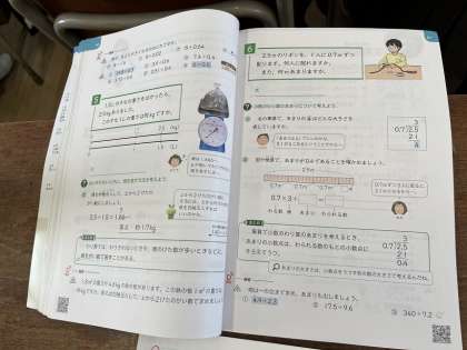 「あまりのある計算のしかたを考えよう」。小数の割り算のあまりについて、筆算や数直線を参考に学習しました。