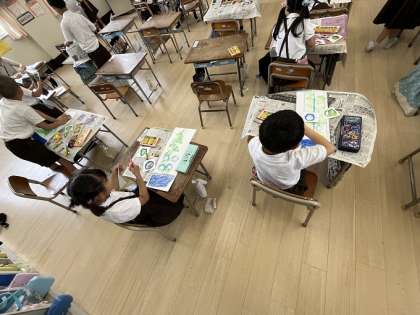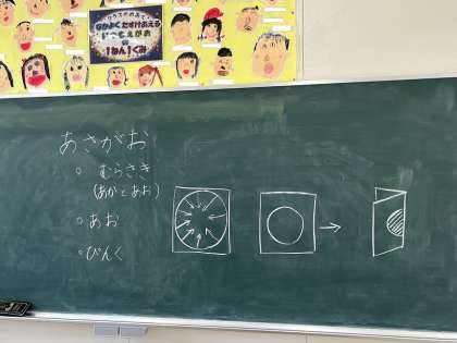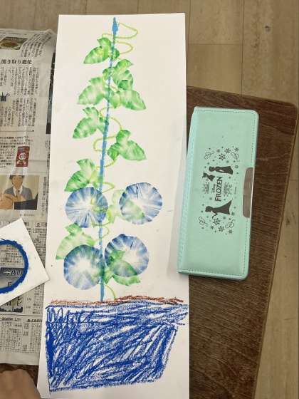 アサガオの絵を完成させました。むらさき、あお、ぴんく のきれいなアサガオができあがっていました。