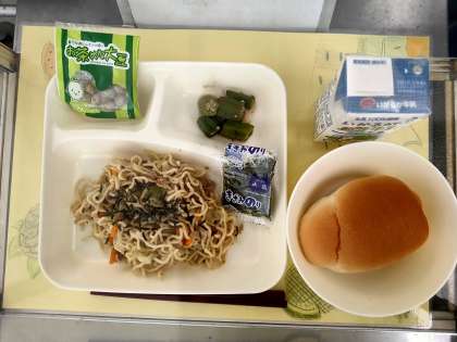 今日の献立は、和風焼きそば、きざみのり、オクラのかつお梅風味、まっ茶大豆、ミニコッペパン、牛乳です。