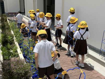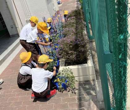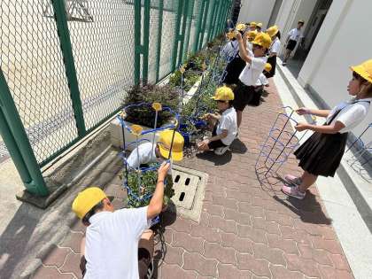 プチトマトの鉢に、囲いのさくをたてました。まだ青いプチトマトのつるもどんどん伸びていっぱい実をつけてくれそうです。