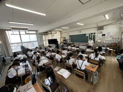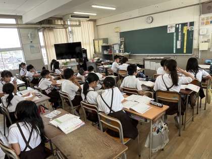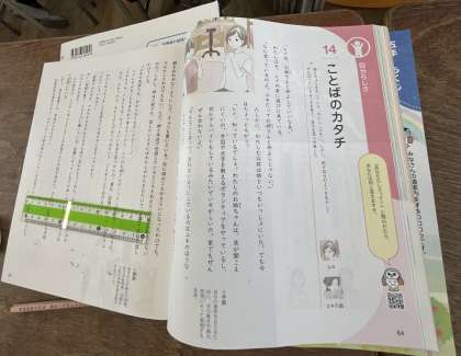 「ことばのカタチ」。自分とのきょりをおいていた姉が自分のよさを生かしてがんばっているようすを見て、主人公は自分を見直そうとしています。じぶんらしさについて考えます。今は、最初の場面について隣同士で話し合っています。