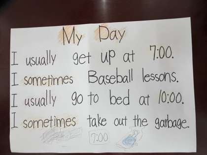 ふだんの自分の生活の様子を、友達に紹介する文を書いて、知りたいことをたずねあう練習をしています。