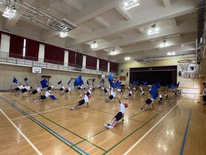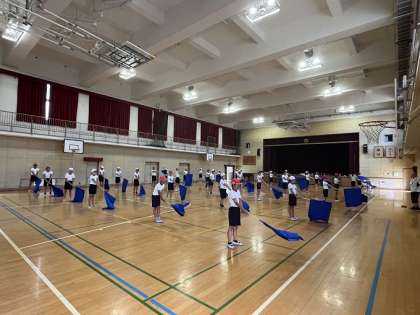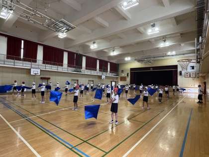 今日も雨や雷注意報などの天候不良で水泳は中止になりました。6年生は講堂でフラッグの練習をしています。運動会は11月8日(土)ですが、少しずつ練習を積み重ねていきます。