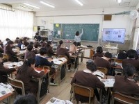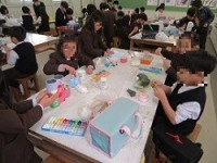 グループやペアで英会話の練習をしています。プリントをできるだけ見ずに会話できるようになるといいですね。